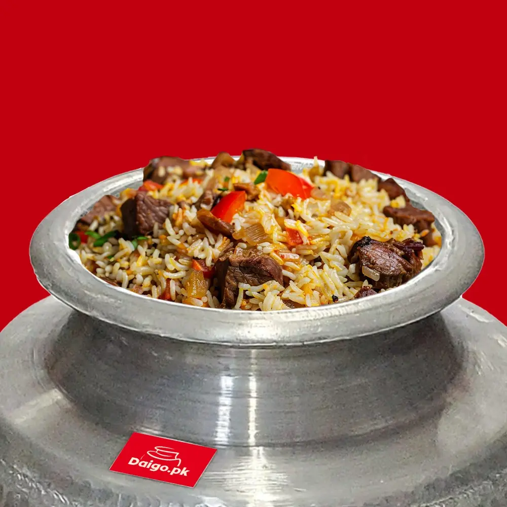 Enjoy the classic Beef Pulao from Daigo—an excellent option for catering in Peshawar. With tender beef and aromatic rice, this daig is perfect for weddings and gatherings. Our food delivery service ensures freshness and quality. Visit Daigo for price and booking information